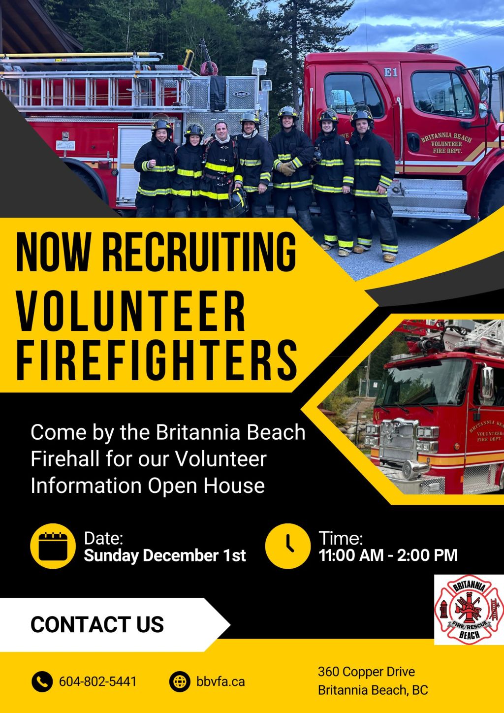 This will be an informal, drop-in opportunity for anyone interested in joining the Britannia Beach Volunteer Fire Department. We’ll have members there to answer any questions that you might have, and you can tour the hall, check out our equipment, and see if volunteering might be a fit for you.